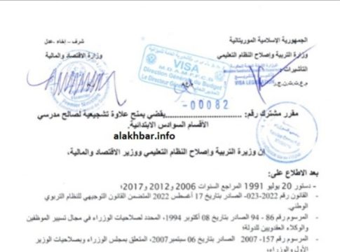 وقعت وزيرة التربية وإصلاح النظام التعليمي هدى باباه، ووزير الاقتصاد والمالية سيدي أحمد ولد أبوه، مقررا مشتركا يقضي بمنح علاوة تشجيعية قدرها 20 ألف أوقية قديمة لصالح مدرسي أقسام السوادس من التعليم الابتدائي.