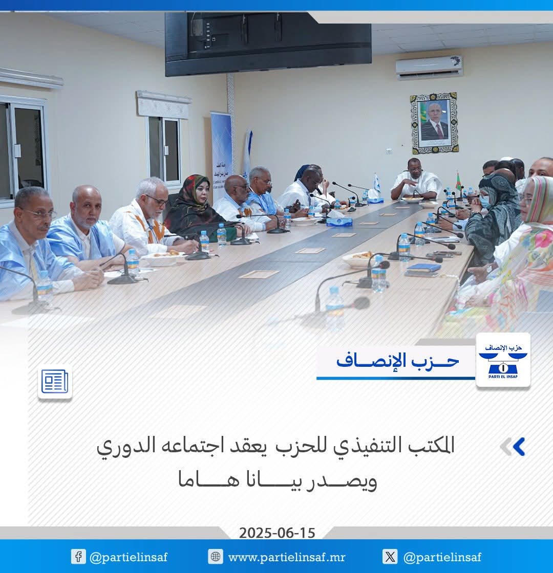 اجتمع المكتب التنفيذي لحزب الإنصاف في دورة عادية مساء الأحد 15 يونيو 2025، بمقر الحزب بنواكشوط، تحت رئاسة السيد سيد أحمد ولد محمد رئيس الحزب، وتمحور جدول أعمال الاجتماع حول:
