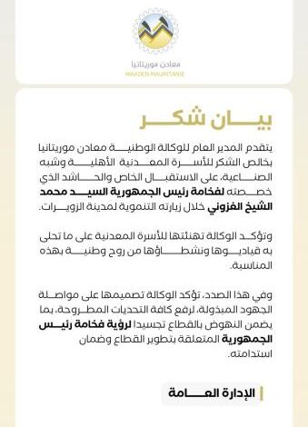 أصدرت الوكالة الوطنية لمعادن موريتانيا بيان شكر ثمّنت فيه الاستقبال الخاص والحاشد الذي خصصته الأسرة المعدنية بمدينة الزويرات لفخامة رئيس الجمهورية السيد محمد الشيخ الغزواني، خلال زيارته التنموية للمدينة.