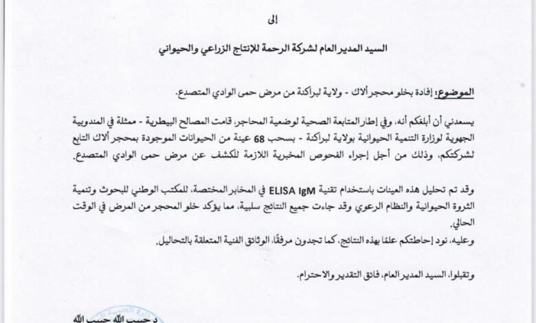 وأظهرت نتائج التحاليل أن جميع العينات كانت سلبية، مما يؤكد خلو المحجر من مرض حمى الوادي المتصدع في الوقت الراهن، ويعكس فعالية إجراءات المراقبة الصحية المعتمدة.