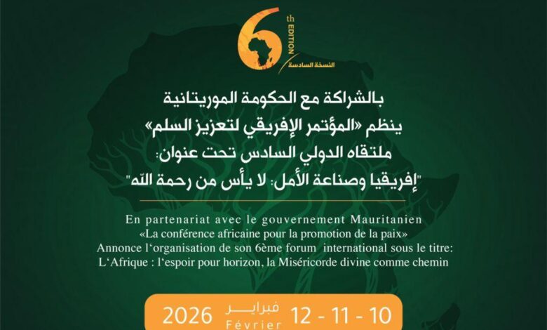 أعلن المؤتمر الإفريقي لتعزيز السلم، اليوم الأربعاء، أن العاصمة الموريتانية نواكشوط ستستضيف الملتقى الدولي السادس للمؤتمر، خلال الفترة من 10 إلى 12 فبراير 2026، برعاية رئيس الجمهورية محمد ولد الشيخ الغزواني، وبالرئاسة العلمية للشيخ عبدالله بن بيّه.
