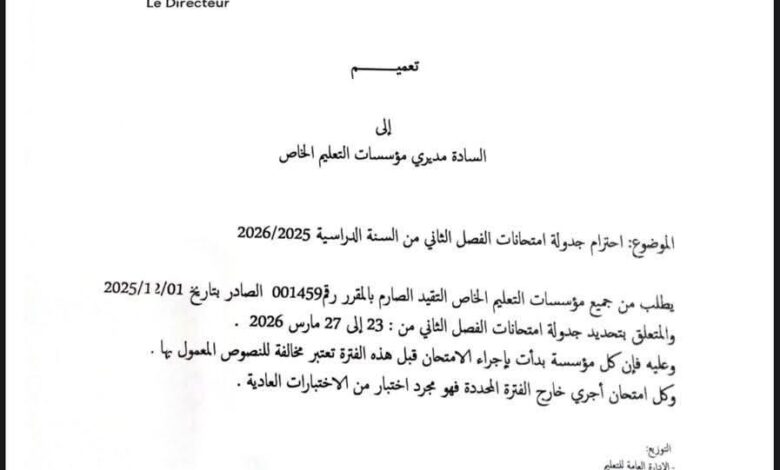 جاء ذلك في تعميم صادر عن مديرية التعليم الخاص وموجّه إلى مديري المؤسسات التعليمية الخاصة، أوضحت فيه أن أي امتحانات نُظمت قبل هذا التاريخ لا تدخل ضمن الامتحانات المعتمدة، وإنما تُصنّف في إطار الاختبارات التقييمية فقط