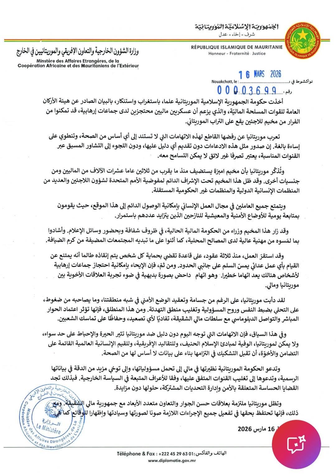 الحكومة الموريتانية تنشر بيان رفض وتنديد باتهانات صادرة عن الحكومة المالية