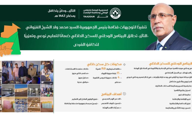 الرئيسية/أخبار/تنفيذًا لتوجيهات فخامة رئيس الجمهورية السيد محمد ولد الشيخ الغزواني «التآزر» تطلق البرنامج الوطني للسكن الداخلي ضمانًا لتعليم نوعي وتعزيزًا لتكافؤ الفرص تنفيذًا لتوجيهات فخامة رئيس الجمهورية السيد محمد ولد الشيخ الغزواني «التآزر» تطلق البرنامج الوطني للسكن الداخلي ضمانًا لتعليم نوعي وتعزيزًا لتكافؤ الفرص قبس.إنفو منذ 4 ساعات منذ 4 ساعات شاركها فيسبوك تويتر لينكدإن طباعة