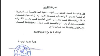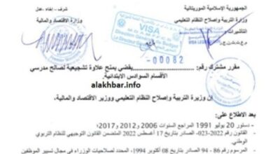 وقعت وزيرة التربية وإصلاح النظام التعليمي هدى باباه، ووزير الاقتصاد والمالية سيدي أحمد ولد أبوه، مقررا مشتركا يقضي بمنح علاوة…