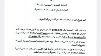 تعميم من وزارة الصحة ، يحصر تزويد المستشفيات بالأدوية على مركزية “كاميك