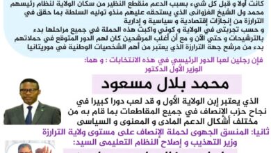 أعلنت ثلاث مجموعات سياسية بولاية اترارزه انسحابهامن حزب الصواب والمسار ، وانضمامها لحزب الإنصاف . جاء ذلك بعد سلسلة لقاءات…