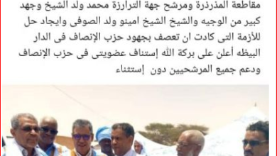 معالي وزير التهذيب الوطني وإصلاح النظام التعليمي،منسق حملة حزب الإنصاف بولاية اترارزه ابراهيم فال ولد محمد الامين،،ينجح في حل إشكال سياسي معقد بالمذرذه ، أدى إلى إنهاء محودن ولد حوناه تجميد عضويته في حزب الإنصاف ، وإعلانه دعم كل لوائح الحزب
