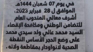 معالي المندوب العام للتضامن الوطني ومكافحة الإقصاء “التآزر” السيد محمد عالي ولد سيدي محمد يضع ظهر اليوم بمدينة النعمة الحجر الأساس لمدرسة كلبه