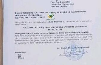 أصدرت وزارة الصحة تعميما يقضي بسحب الكميات الموجودة من دواء FUCIDINE Tab 250mg 10 ALUB F+E من الأسواق، بسبب مشكلة…