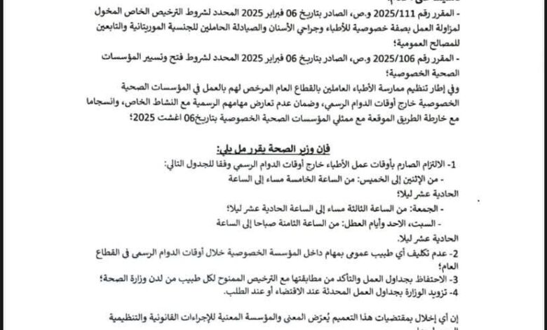 أكمل القراءة »أعلنت وزارة الصحة عن جدول مداومة جديد للأطباء في العيادات الخاصة يحظر عليهم العمل ابتداء من الساعة الـ11 ليلا. …